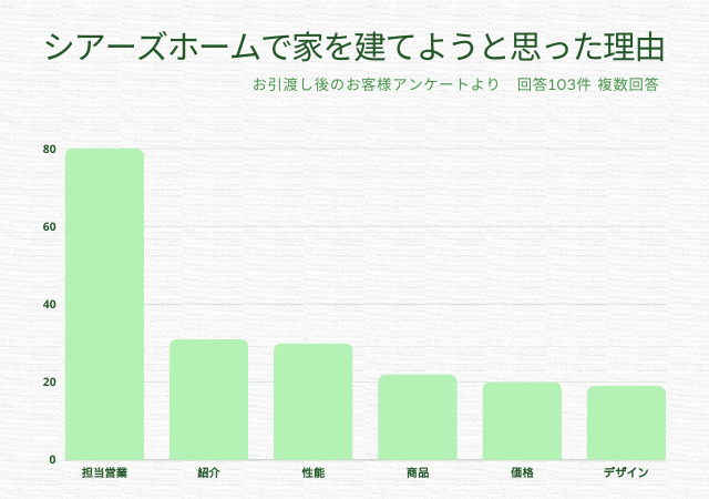 こちらはシアーズホームのお客様のアンケート結果です。シアーズホームで家を建てようと思った理由の中で、担当営業が最も重要視されていたことが分かります。